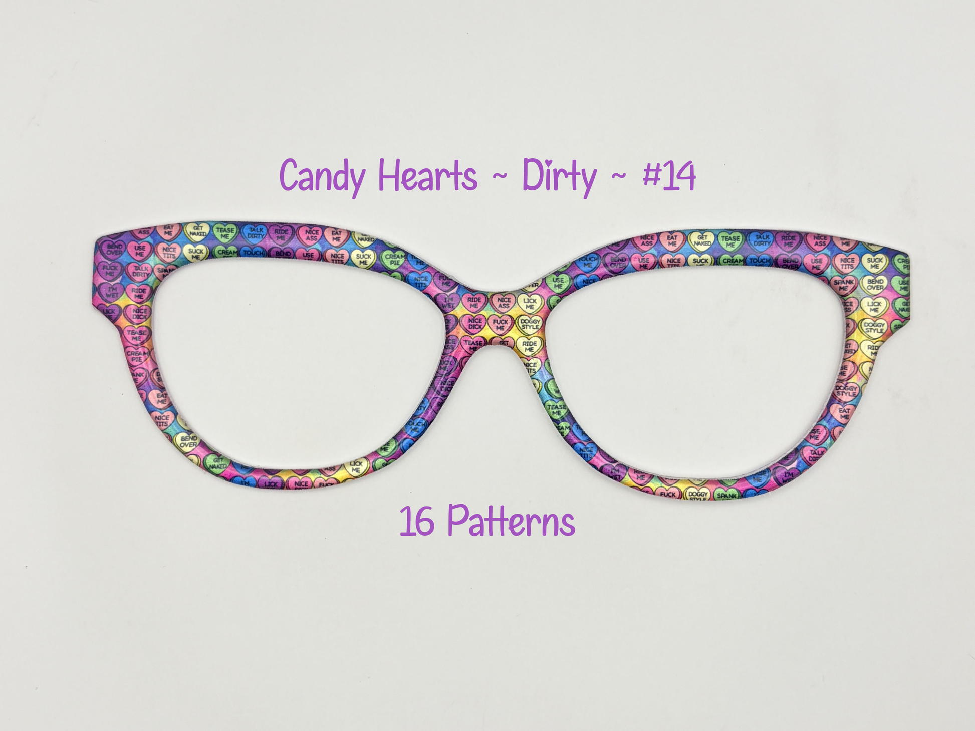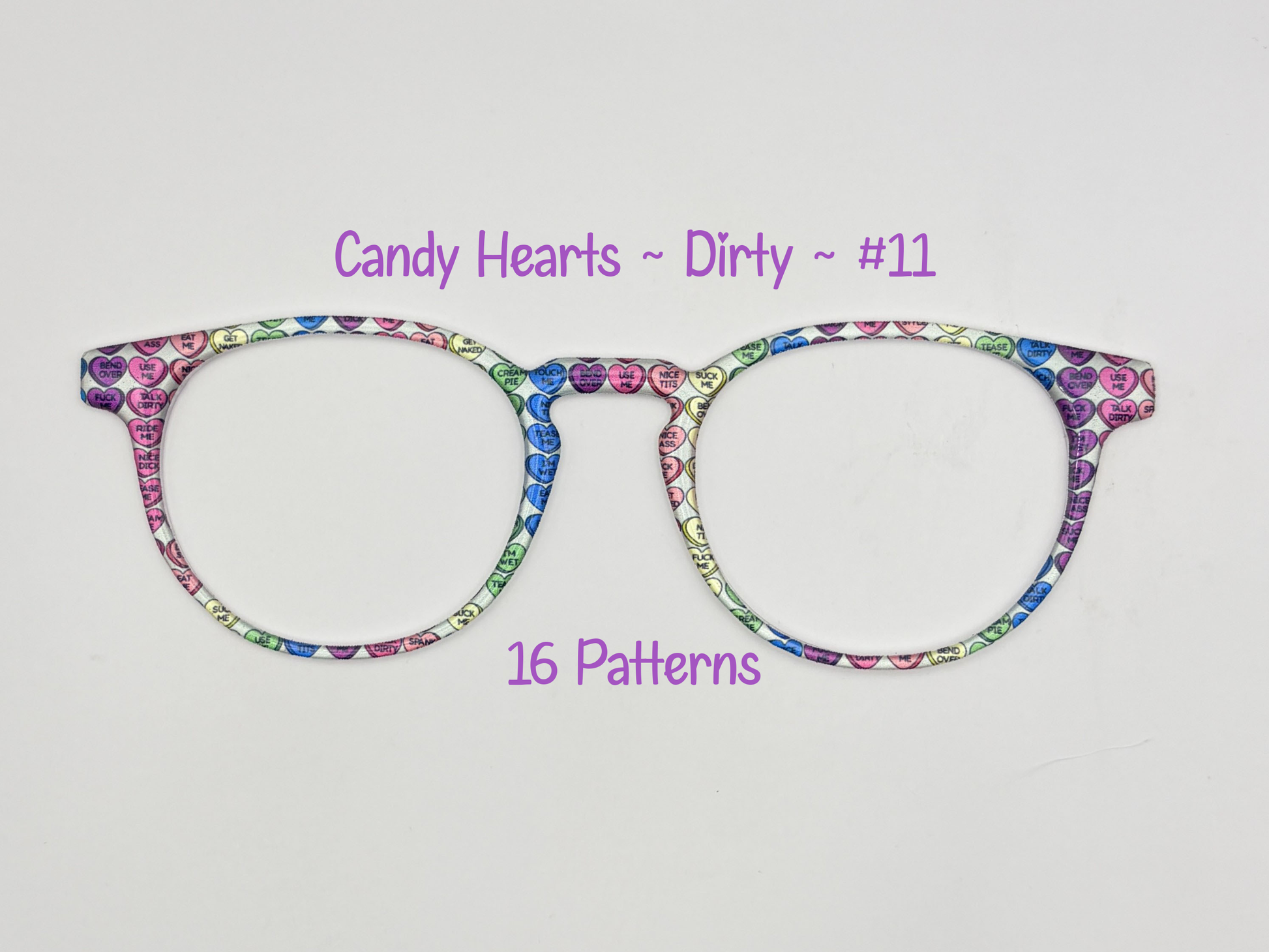 Provocative candy hearts with edgy, unfiltered sayings attach to your eyeglasses as bold statement pieces. These daring toppers infuse your frames with irreverent personality and fearless flair, turning everyday eyewear into a declaration of confidence. Wear your attitude front and center.